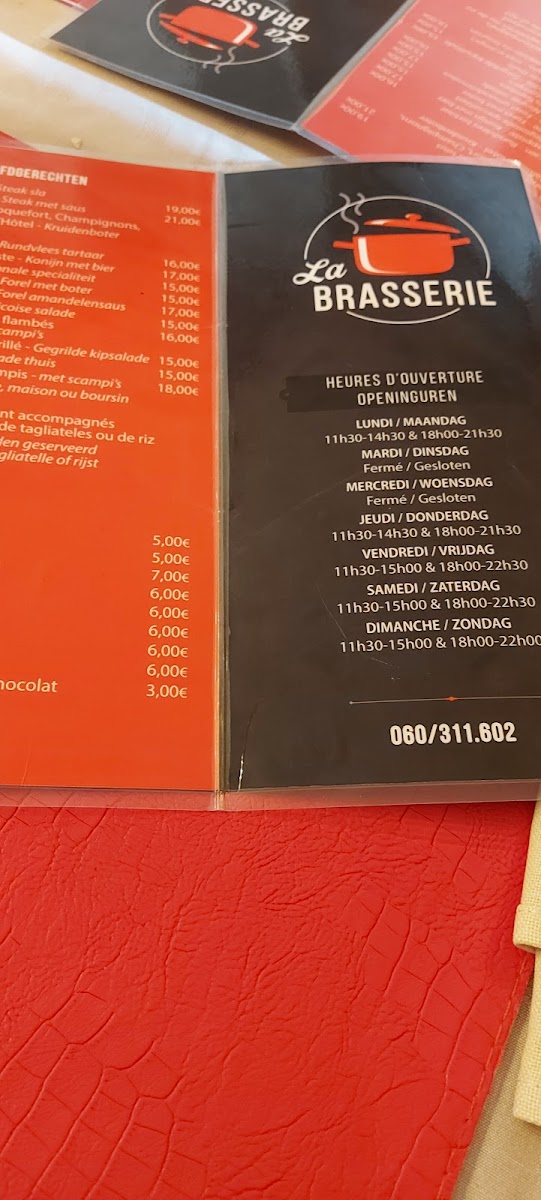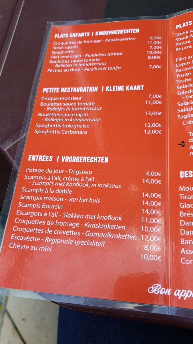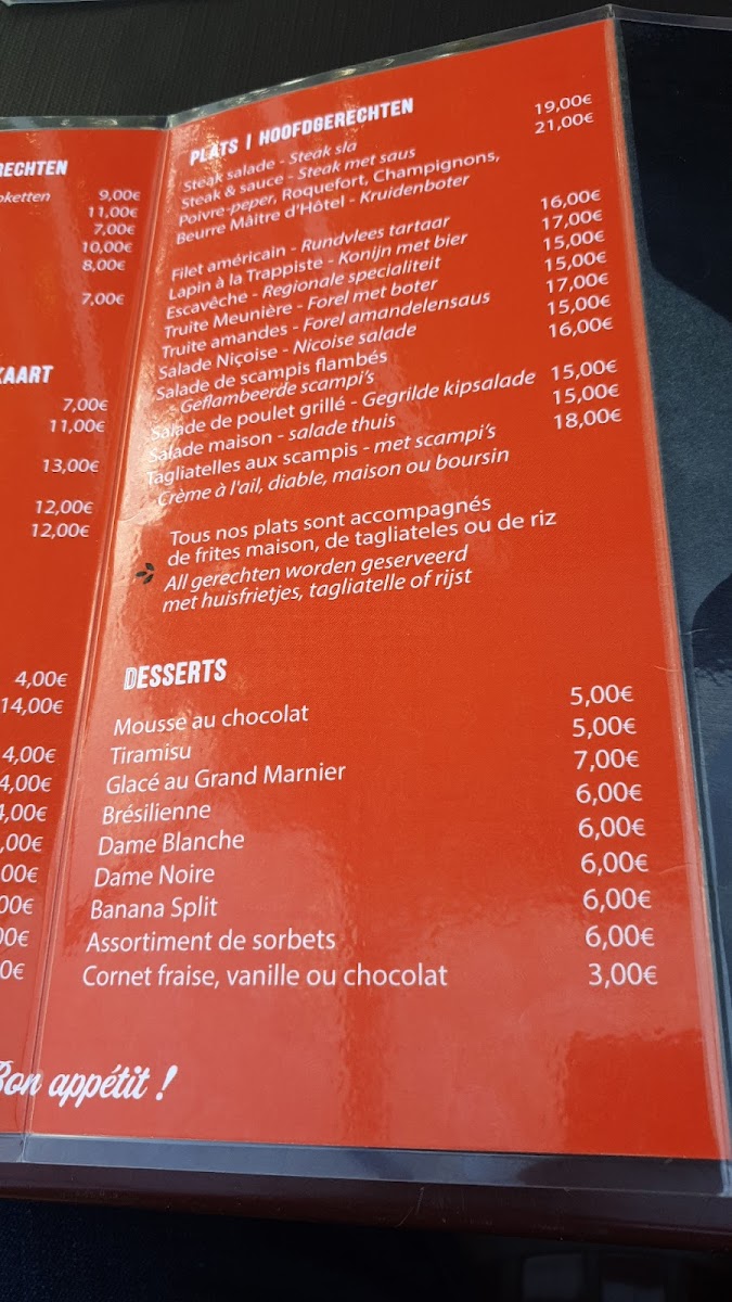 The menu at Saveurs & Chakras in Froidchapelle reflects a confident, generous approach to European dining, where classic technique meets hearty portions and clear flavors. Signature dishes such as Couronne d'agneau immediately signal a focus on well-executed meat dishes, offering a robust and satisfying experience that appeals to guests looking for something rich and comforting. Seafood lovers are equally well served with Filet de Sole Meunière Sauce Estragon, a dish that highlights freshness and balance, combining delicate sole with the aromatic lift of tarragon for a refined yet approachable plate. Lighter options on the menu, including Salade de Scampis and Salade Met Gambas, provide contrast through freshness and texture, making them ideal starters or main choices for those seeking something more vibrant and less heavy, while still maintaining generous portions. The menu also shows personality and honesty in dishes like Biefstuk Goed Gebakken Wel Veels Te Veel Kruidenboter Maar Dat Kan Je Eraf Halen, which emphasizes a well-cooked steak paired with an intentionally abundant serving of herb butter, allowing diners to adjust richness to their own taste. Overall, the selection feels cohesive and thoughtfully composed, balancing meat, seafood, and salads in a way that caters to different appetites without losing its identity, and leaving a clear impression of a menu built around flavor, satisfaction, and a straightforward enjoyment of food.